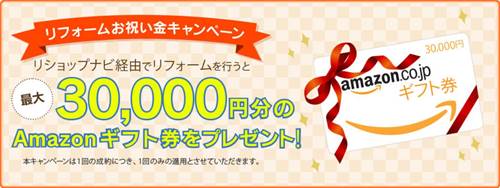 さらに、リショップナビからリフォームをすると、最大で30,000円分のAmazonギフト券がもらえるキャンペーンもやっています。